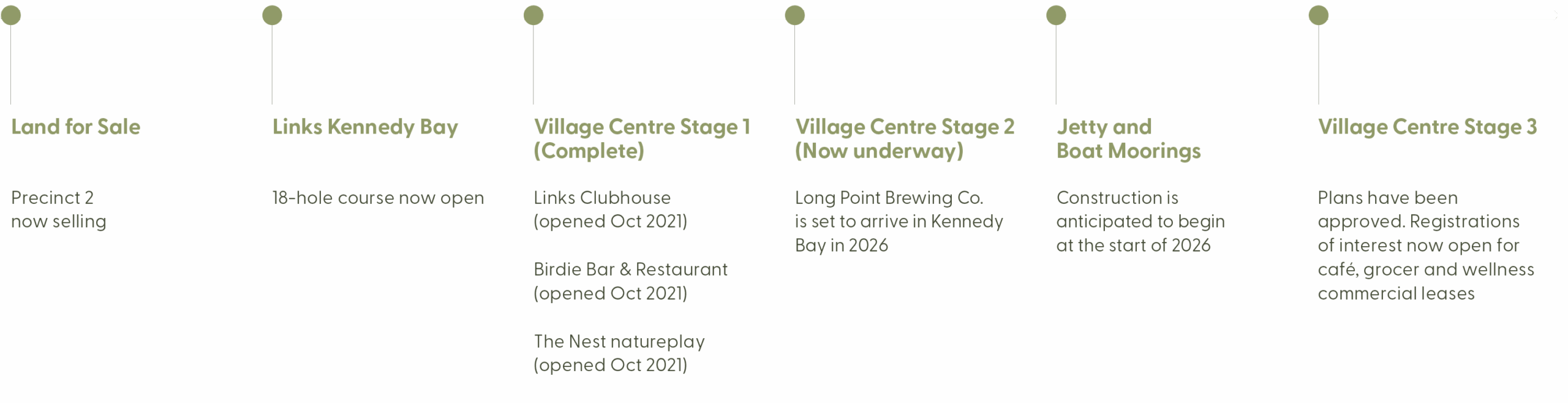 Development of the Kennedy Bay village centre plans have been approved, with construction anticipated to commence in 2026. The plans feature a beachfront corso with a boutique grocer, café and restaurant, sitting alongside boutique hotel accommodation, Long Point Brewing Co. and the public jetty.